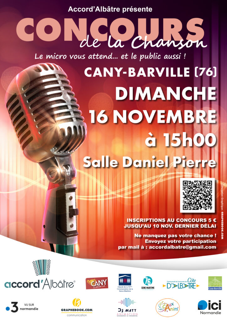 Dimanche 16 novembre Concours de la Chanson, le micro vous attend... et le public assai ! Salle Daniel Pierre de Cany-Barville à 15h00. Inscriptions au concours 5 € jusqu'au 10 novembre. Ne manquez pas votre chance ! Envoyez votre participation par mail à : accordalbatre@gmail.com