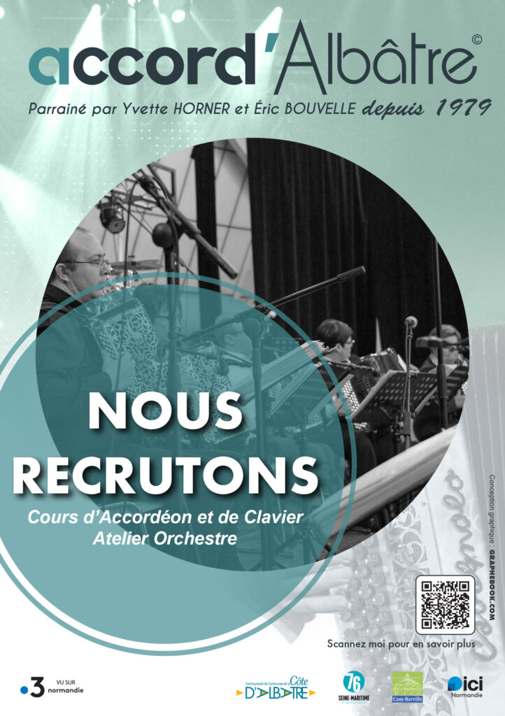 Aujourd’hui, Accord’Albâtre est en pleine phase de recrutement. Nous recherchons des accordéonistes de tous niveaux, à condition qu’ils soient motivés, mais aussi des guitaristes, bassistes, chanteuses ou chanteurs souhaitant rejoindre une formation conviviale et dynamique. Pour les enfants débutants, nous proposons des cours d’initiation avec prêt d’accordéon, afin de leur permettre de découvrir cet instrument dans les meilleures conditions.
